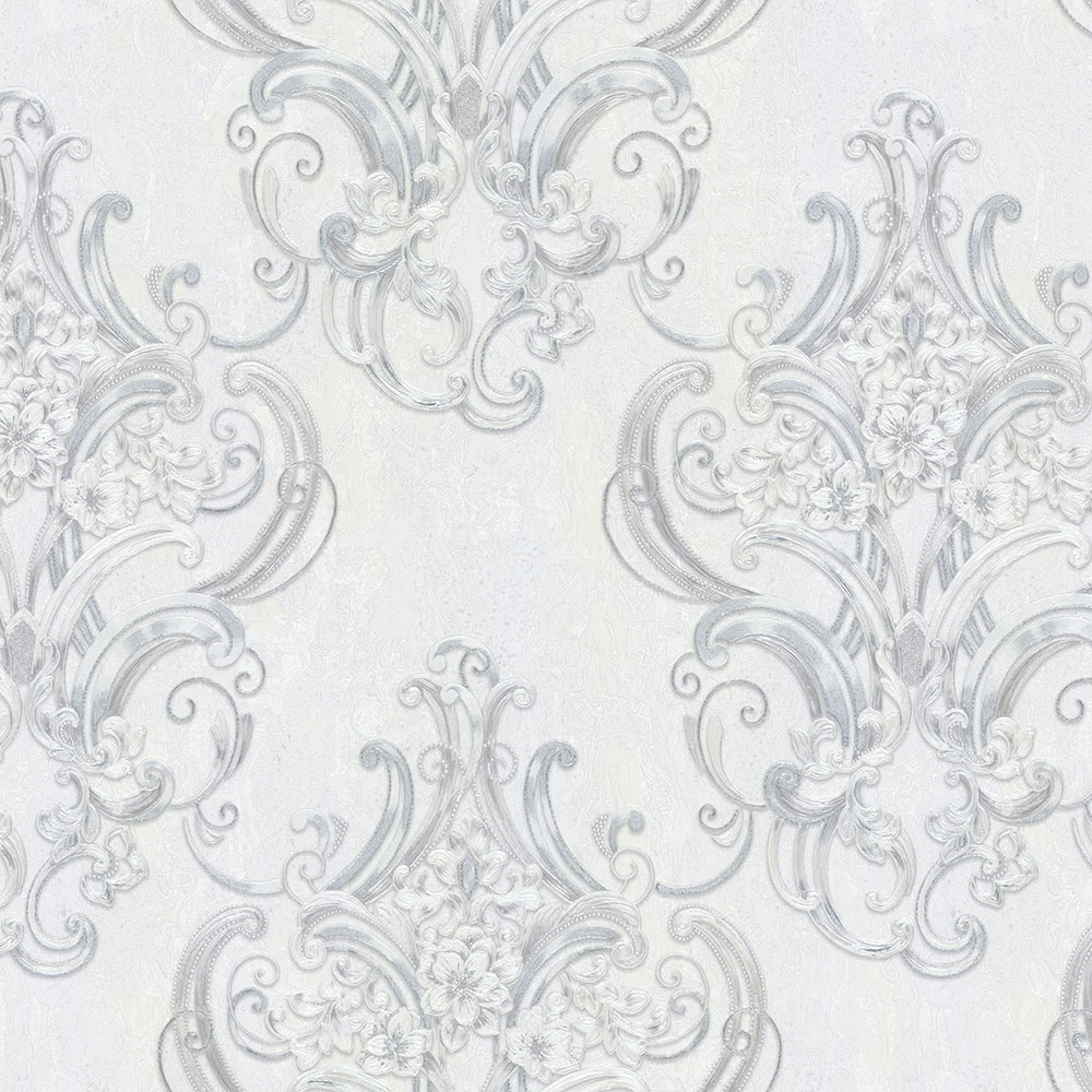 Hellgraue silberne Luxustapete mit einem markanten Ornamentmuster.