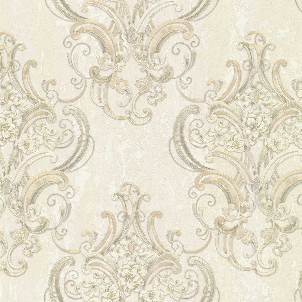 Beige-goldene Luxustapete mit markantem Ornamentmuster.