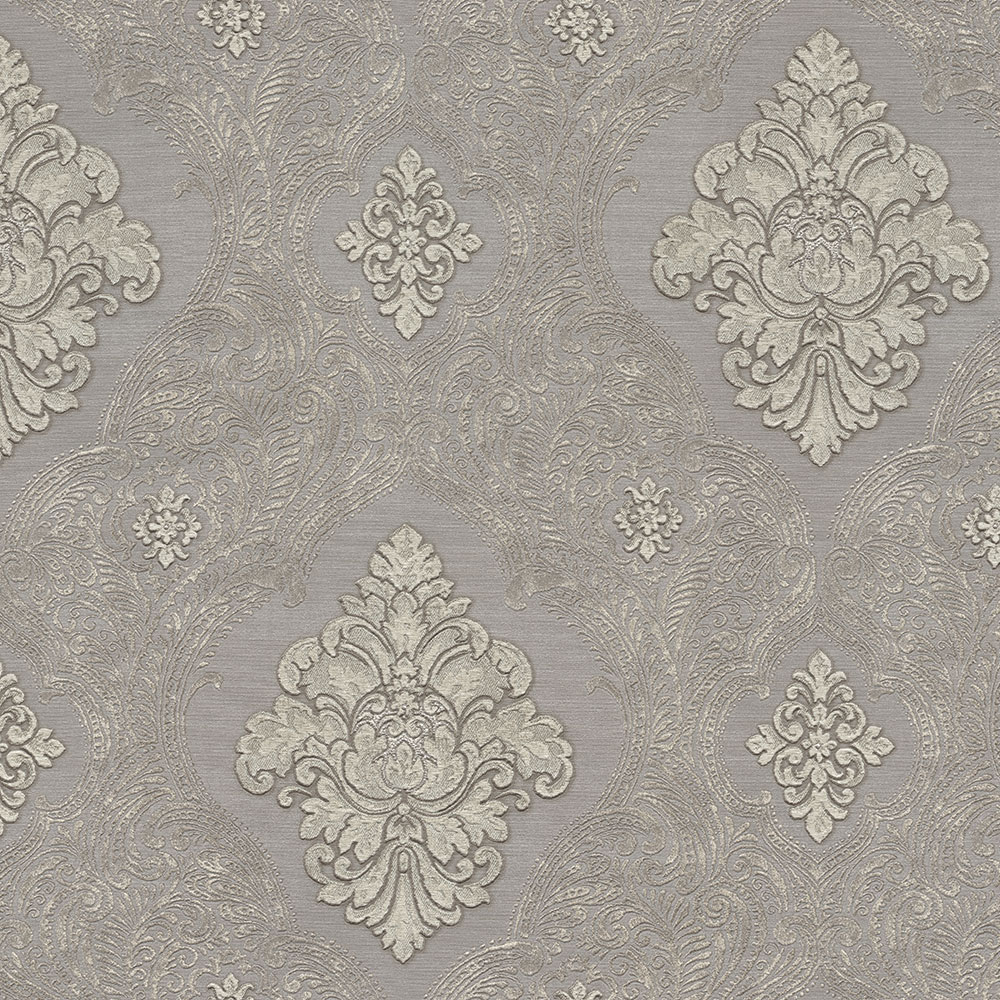 Graue Luxustapete mit einem markanten Ornamentmuster.