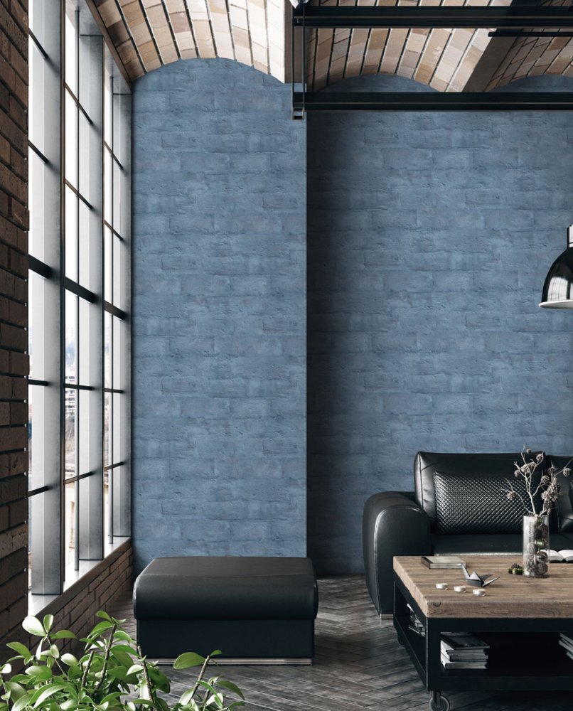 Rollenbreite 1,06 m. Abwaschbare Tapete, blaues Ziegelmuster, Ziegelwände.