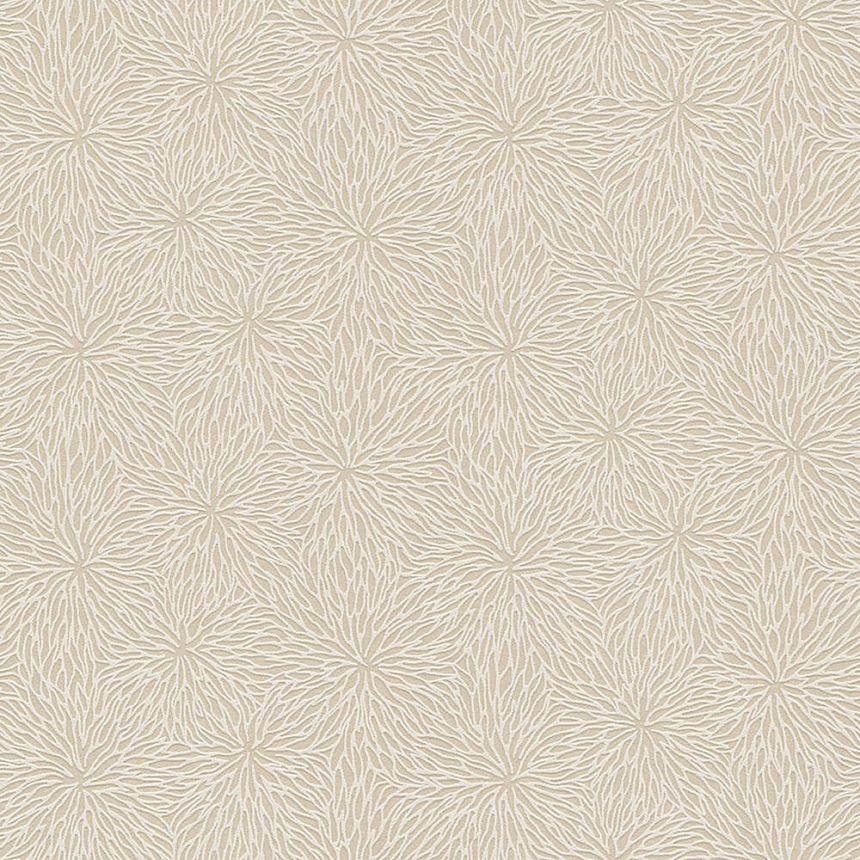Vlies, metallic beige halbglänzende Tapete mit floralem Muster. Konturen aus plastischem cremefarbener Flock.