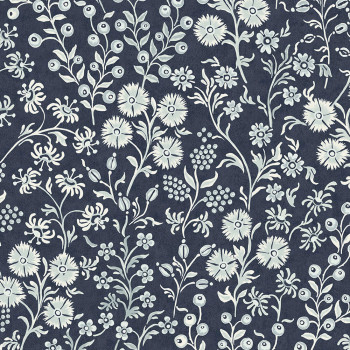 Blumentapete mit Naturmotiven in Dunkelblau und Weiß.