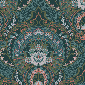 Markantes Blumenmuster in Pastelltönen von Oliv, Orange und Petrol.