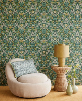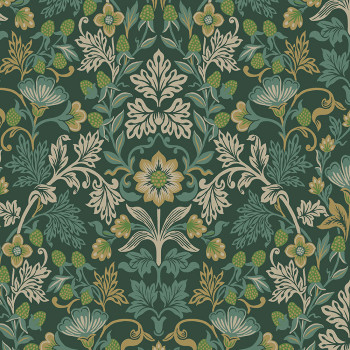 Ornamentale Blumentapete auf dunkelgrünem Hintergrund mit natürlichen Motiven.