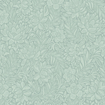 Blumentapete mit Naturmotiven in Hellgrün und Grau.