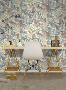 Kindertapete - Stadt, Großstadtleben, gedeckte Braun-, Lila- und Grüntöne.
