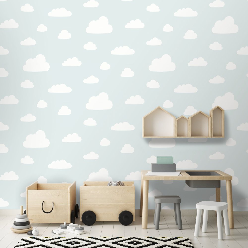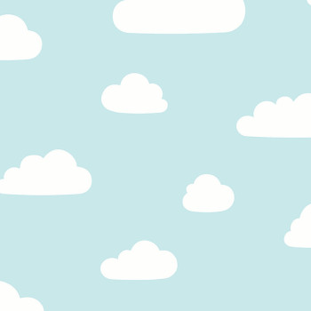 Türkisfarbene Kindertapete mit weißen Wolken.