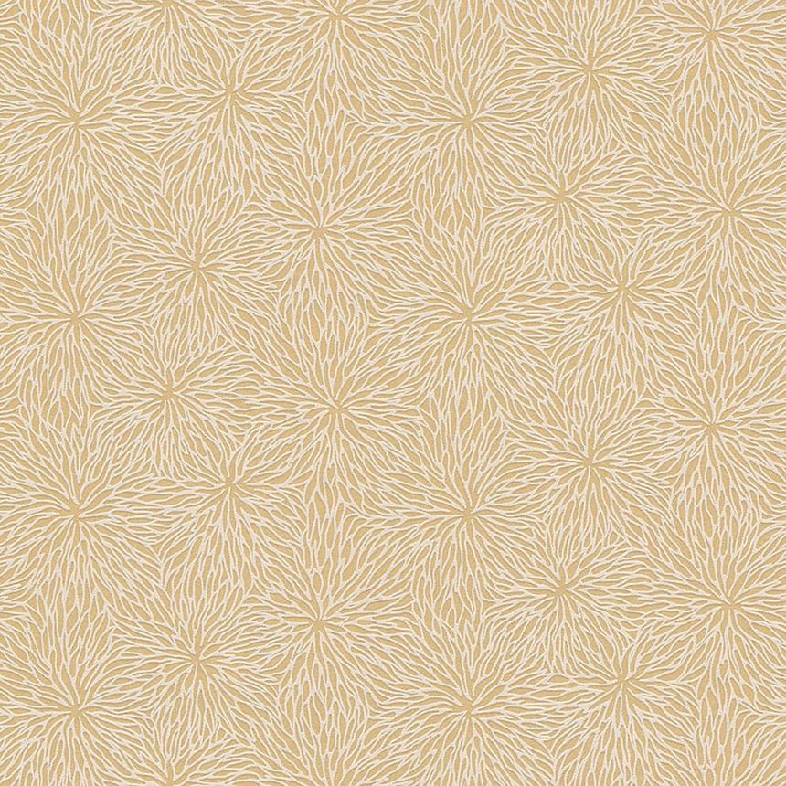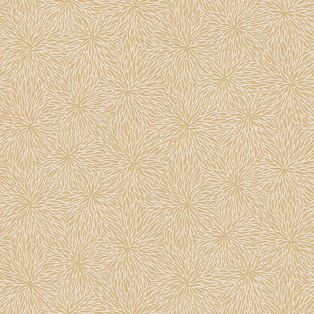 Vliestapete mit floralem Muster. Konturen aus plastischem Softflock, glatter, gold-beige Hintergrund, weiße Konturen.