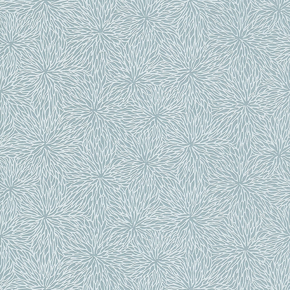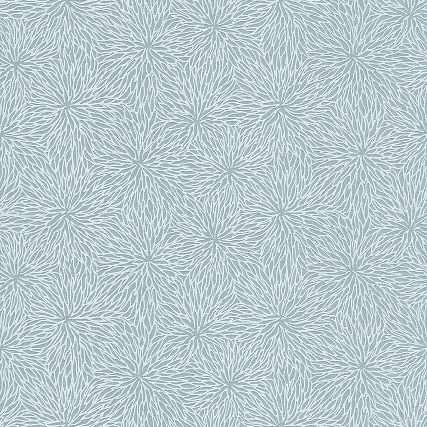 Vlies, metallicblau halbglänzende Tapete mit floralem Muster. Konturen aus plastischem Soft-Weich-weißer Flock.