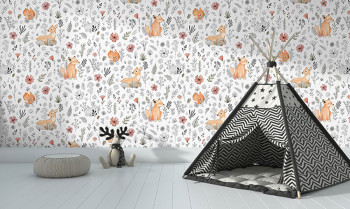 Kindertapete mit Motiven von Blumen, Pflanzen und Waldtieren.