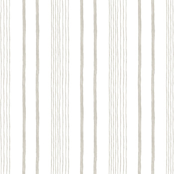 Weiße Tapete mit grau-beigen Streifen.