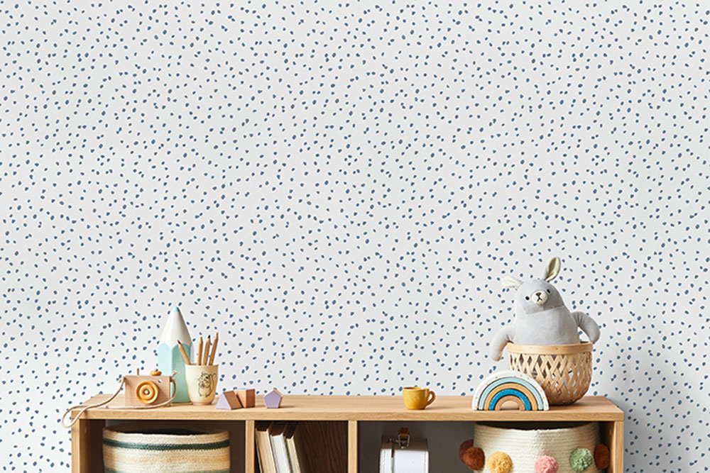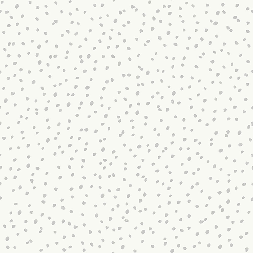 Weiße Kindertapete mit grauen Flecken / unregelmäßigen Punkten.
