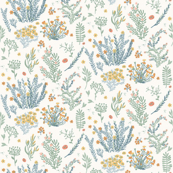 Kindertapete, ein Motiv aus Blumen und Pflanzen auf cremefarbenem Hintergrund.
