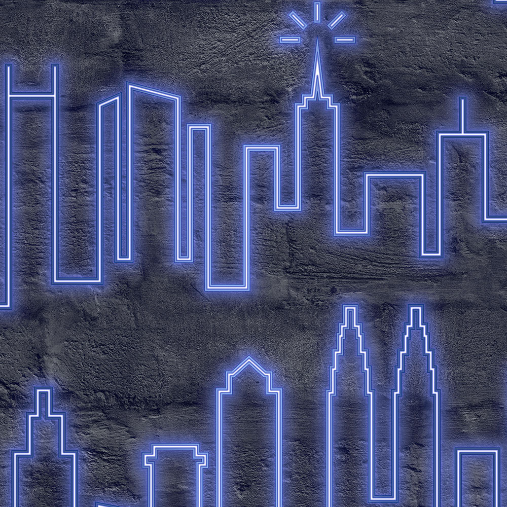 Neontapete - Umrisse von New Yorker Gebäuden aus blauem Glitzer, die im Dunkeln leuchten.