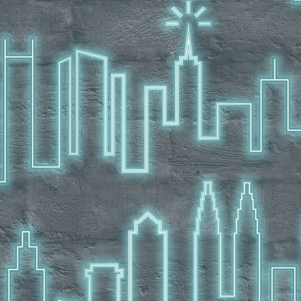 Neontapete - Umrisse von New Yorker Gebäuden aus grünem Glitzer, die im Dunkeln leuchten.