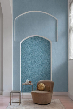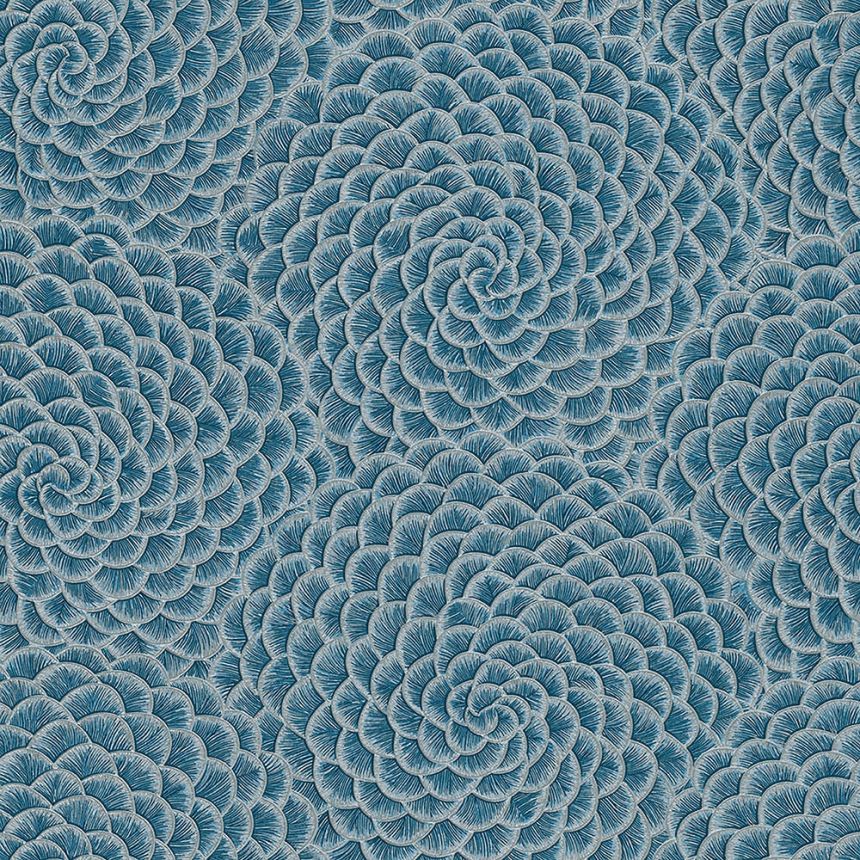 Vliestapete mit Blütenblättern. Blau-silberne, feinplastische Textur.