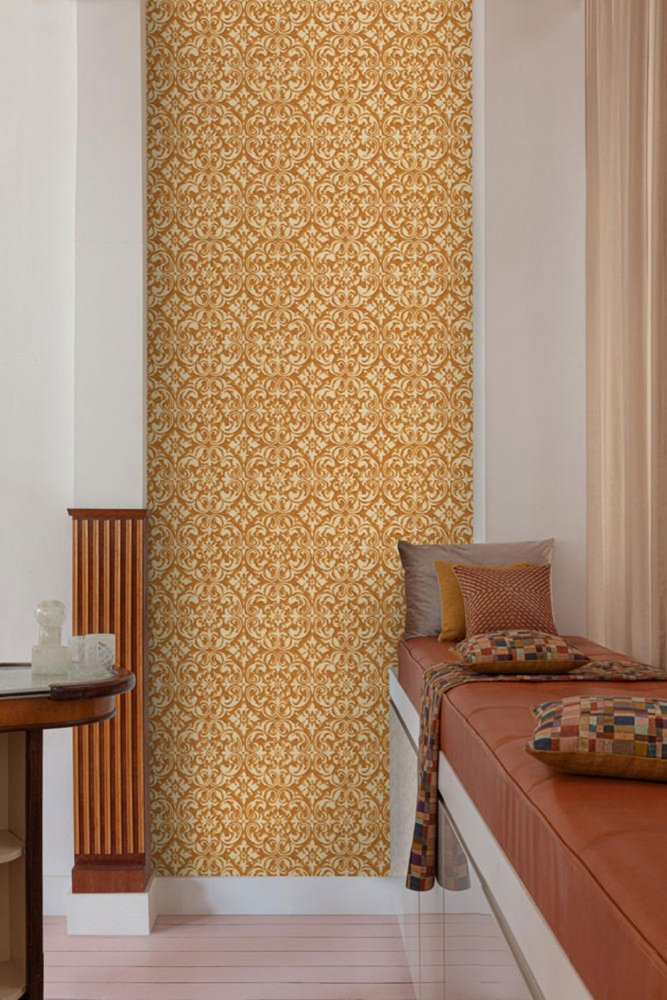 Vlies-Terrakotta-Creme-Tapete mit Ornamenten und silbernen Details.