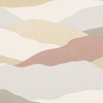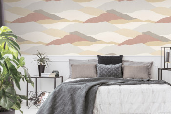 Grafische Tapete, Wellenmotiv, Berge – Weiß-, Grau-, Ocker- und Altrosa-Töne.