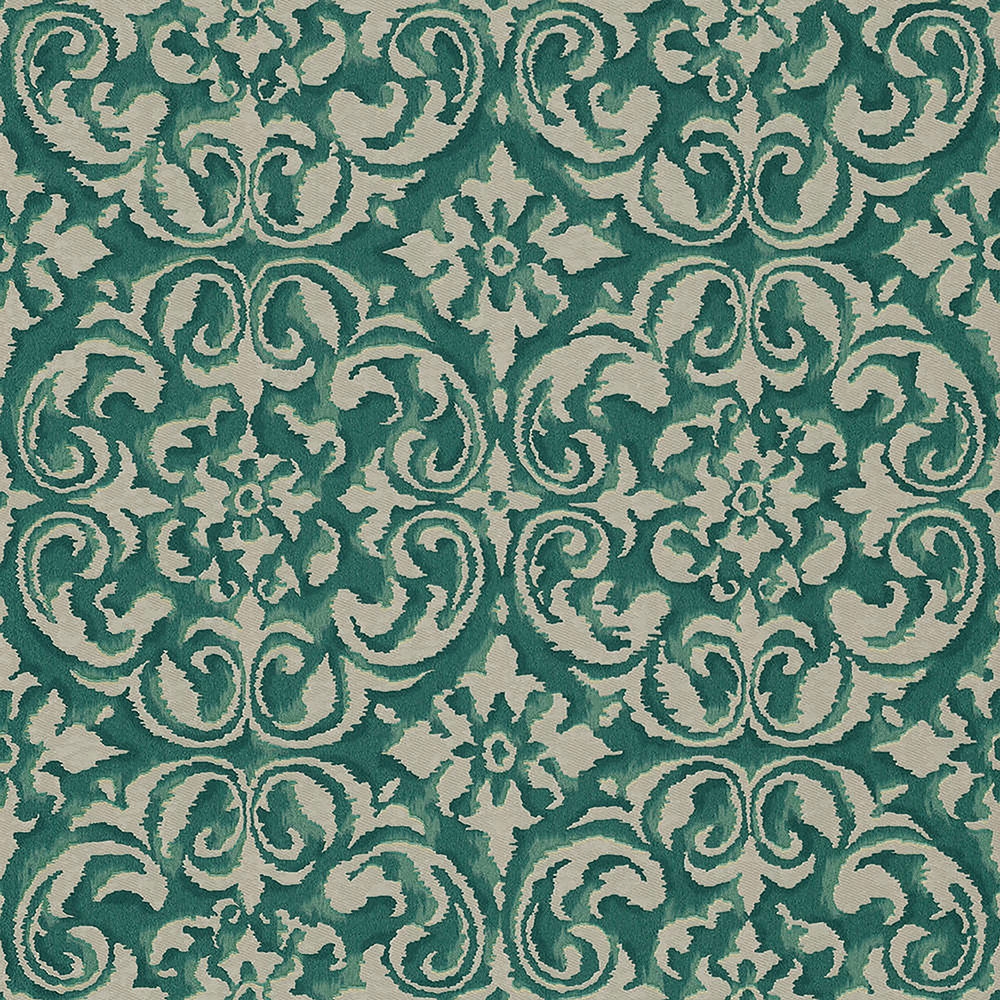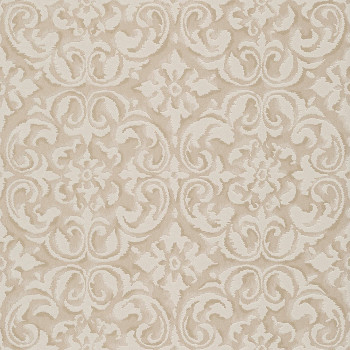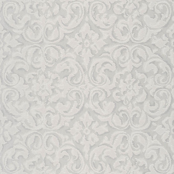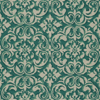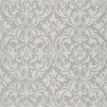 Graugrüne Vliestapete mit Ornamenten und metallischen Details.