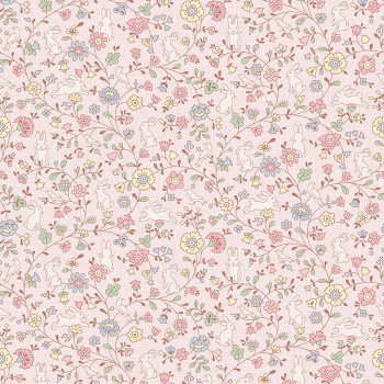 Rosa Kindertapete mit Blumen- und Häschenmotiven. Die Tapete hat eine Stofftextur, sie ist für das Kinderzimmer für die Kleinsten geeignet.