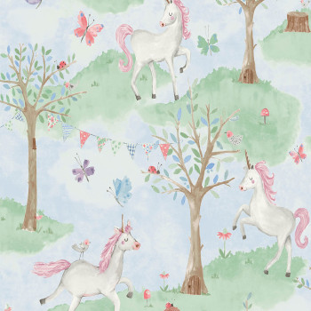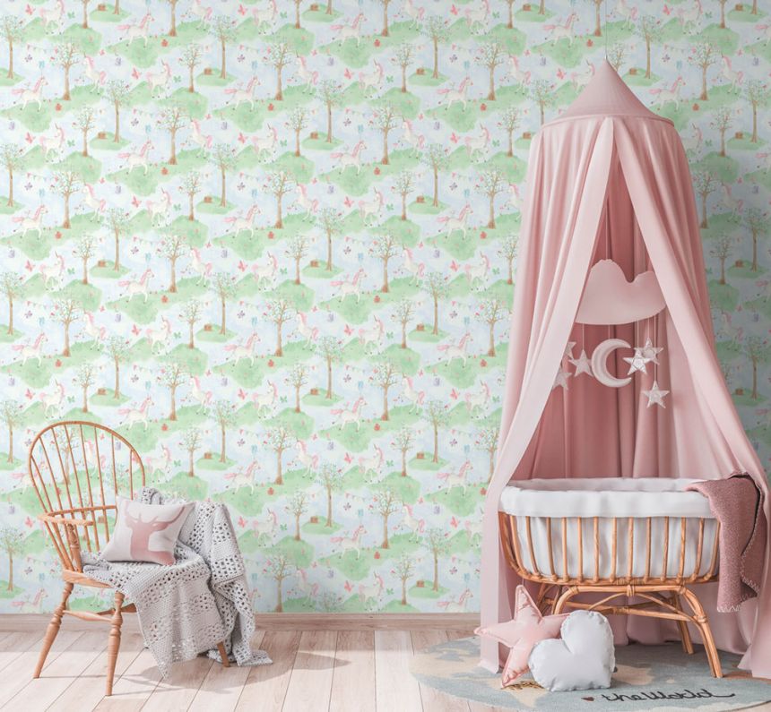 Tapete für ein Mädchenzimmer - mythische Einhörner in einer verträumten romantischen Landschaft. Fördern Sie die Fantasie Ihrer Kinder und schaffen Sie eine Umgebung, in der sie sich wohlfühlen. Tapete, Textur von feinem Stoff.