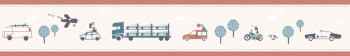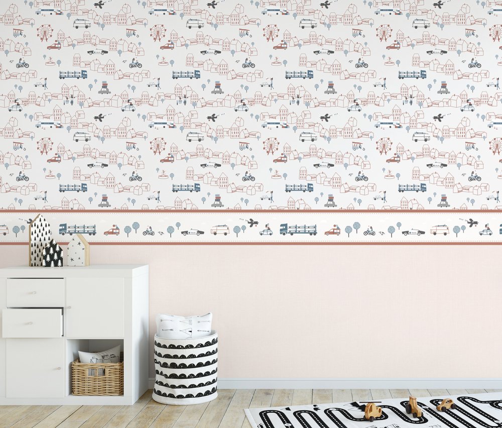 Selbstklebende Kinderbordüre für Jungen - Stadt, Autos, Ziegeltöne, Weiß und Blau.