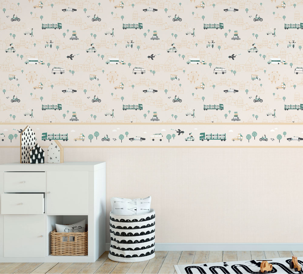 Selbstklebende Kinderbordüre für Jungen - Stadt, Autos, Schattierungen von Beige, Creme und Grün.