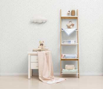 Weiße Tapete mit winzigen graublauen Sternen. Tapete geeignet für Kinderzimmer.