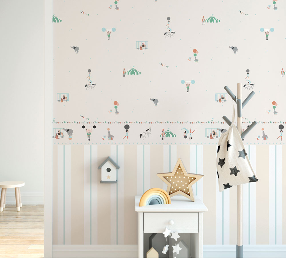 Cremefarbene Tapete, Kindermotiv von Zirkustieren.
