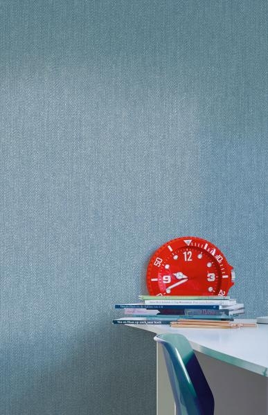 Blaue einfarbige Tapete, Stoffoptik. Einfach mit verwandten Tapeten zu kombinieren.