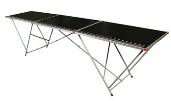 Tapezier- und Universal-Heimwerkertisch in robuster Ausführung, 3 mm starke Arbeitsplatte in Schwarz. Rahmenprofil aus Metall mit Eckverbindern aus Kunststoff, mit Skala für präzisen Zuschnitt