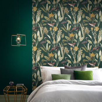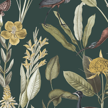 Luxustapete mit Motiv von Reihern, Blättern, Blumen in Grün-, Blau-, Rosa- und Beigetönen auf dunkelgrünem glatten Hintergrund.