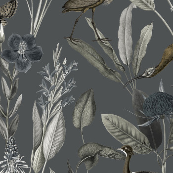 Luxustapete mit Motiv von Reihern, Blättern, Blumen in Grau- und Brauntönen auf grauem glatten Hintergrund.