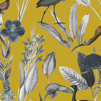 Luxustapete mit Reihern, Blättern und Blumen in Grau auf einem glatten ockerfarbenen Hintergrund.