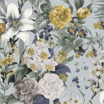 Blumentapete in pastellfarbenen Grün-, Gelb- und Grautönen auf hellgrünem Hintergrund.