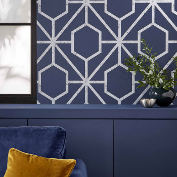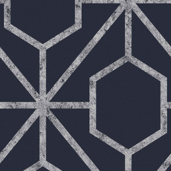 Feine Vliestapete mit geometrischen Mustern - silbernen Kurven auf dunkelblauem, strukturiertem Hintergrund.