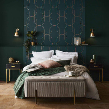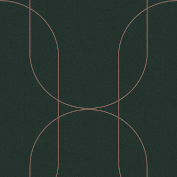 Feine Vliestapete mit geometrischen Mustern - elegante Kurven in Roségold auf einem grün strukturierten Hintergrund.