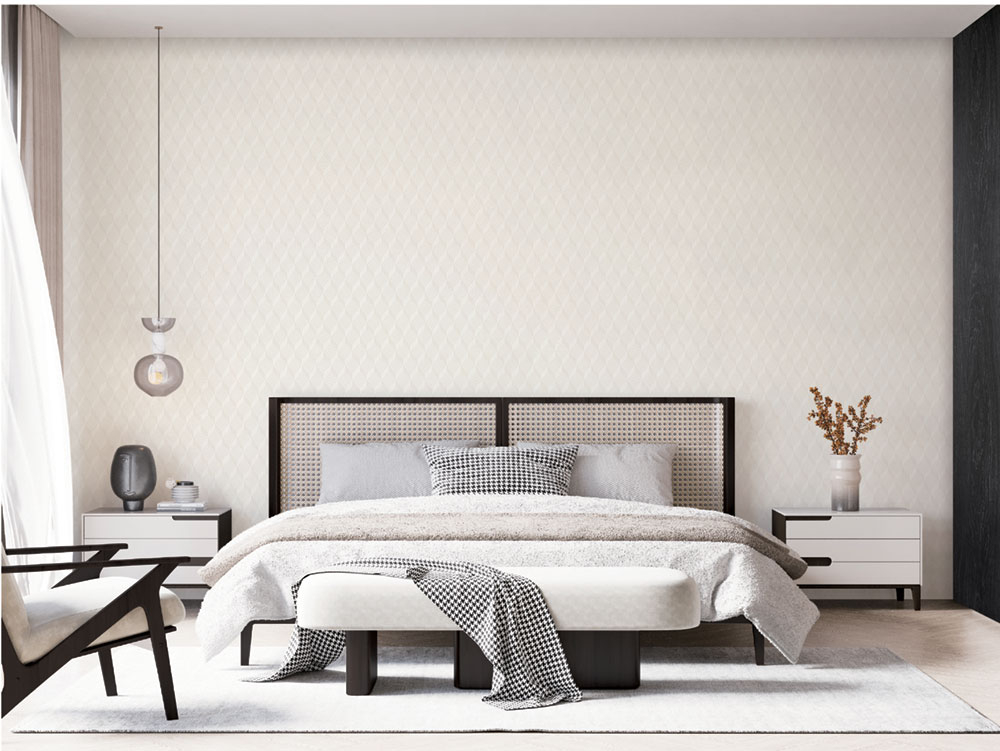 Cremefarbene, halbglänzende Luxustapete mit geometrischem 3D-Muster. Tapete geeignet für Schlafzimmer, Wohnzimmer oder Arbeitszimmer.