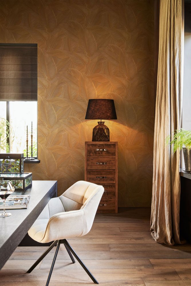 Ockerfarbene Vliestapete mit Blattmuster. Die Tapete ist für Wohnzimmer, Schlafzimmer oder Arbeitszimmer geeignet.