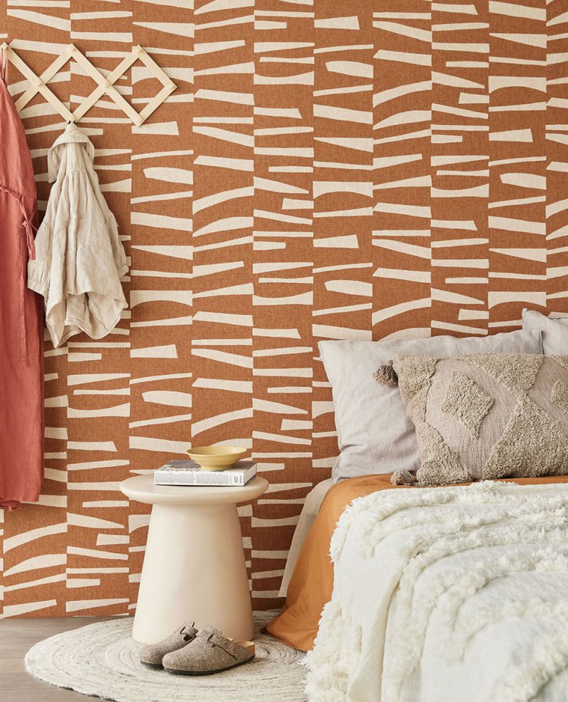Vliestapete mit geometrischen Retro-Mustern, Brauntöne / Terrakotta und Beige. Tapete geeignet für Schlafzimmer, Wohnzimmer und Arbeitszimmer.