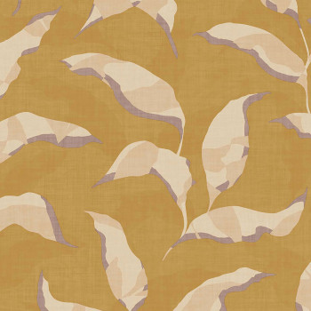 Ockerfarbene Tapete mit beigen Blättern und Zweigen. Tapete geeignet für Wohnzimmer, Schlafzimmer oder Arbeitszimmer.