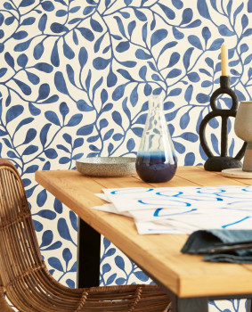 Cremefarbene Tapete mit blauen Blättern und Zweigen. Tapete geeignet für Wohnzimmer, Schlafzimmer oder Arbeitszimmer.