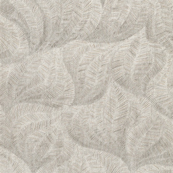 Vliestapete, ein Muster aus stilisierten Blättern in Creme- und Graubrauntönen mit metallischen Gold- und Silberdetails. Die Tapete eignet sich für Wohnzimmer, Schlafzimmer oder Arbeitszimmer.
