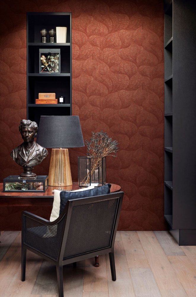 Ziegelrote Vliestapete, Muster aus stilisierten Blättern mit metallischen Gold- und Silberdetails. Die Tapete eignet sich für Wohnzimmer, Schlafzimmer oder Arbeitszimmer.