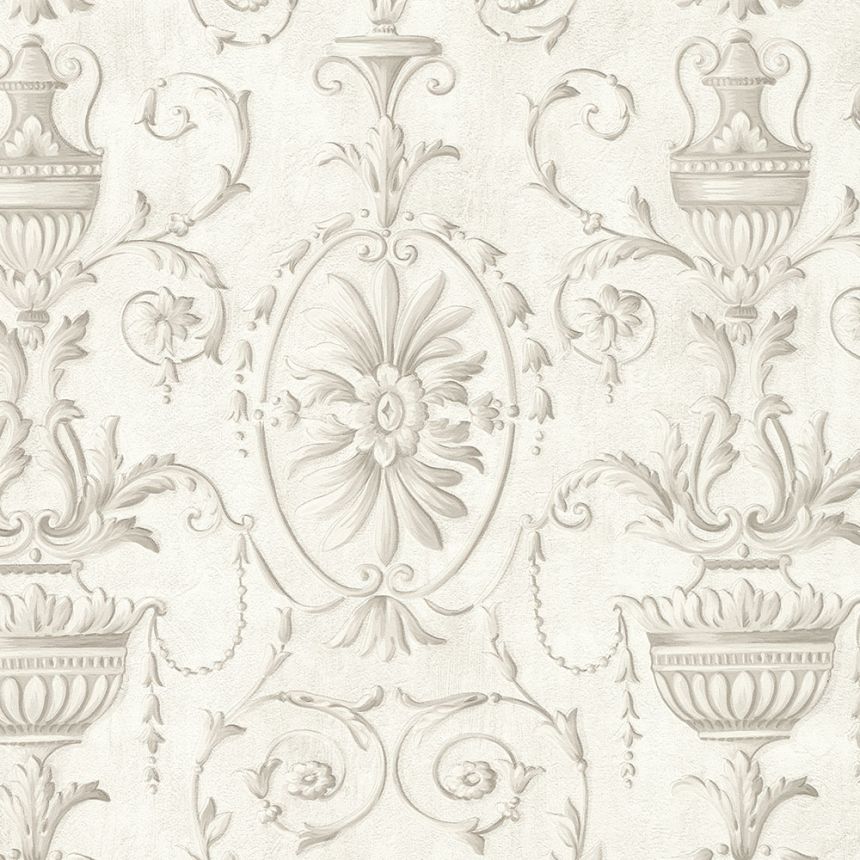 Luxuriöse Vliestapete mit barocken Blumen- und Vasenornamenten auf einem rauen cremefarbenen Stuckhintergrund.