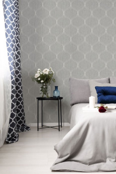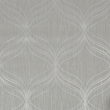 Luxuriöse Vliestapete mit "gepresster" Textur und einem feinen Silber- und Goldornament auf hellgrauem Hintergrund.