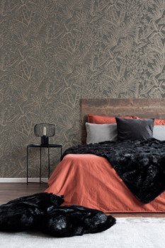 Luxuriöse Vliestapete in Dunkelgrau mit ausgeprägter Stoffstruktur und Kupferblattdekor.