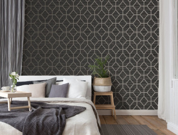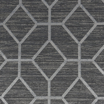 Luxustapete dunkelgrau mit metallischem, geometrischem Muster auf einer strukturierten Oberfläche, die grobe Textilien imitiert.