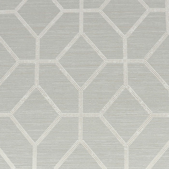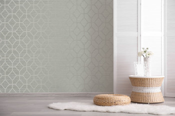 Luxuriöse hellgrüne Tapete mit geometrischem Metallic-Muster auf einer strukturierten Oberfläche, die grobe Textilien imitiert.