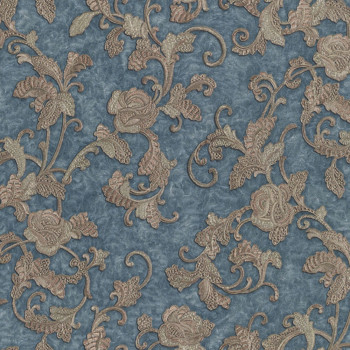 Rollenbreite 1,06 m. Grau-blaue Luxus-Vliestapete - Vinyloberfläche, braun-goldenes barockes Ornamentmuster mit Goldglitter.